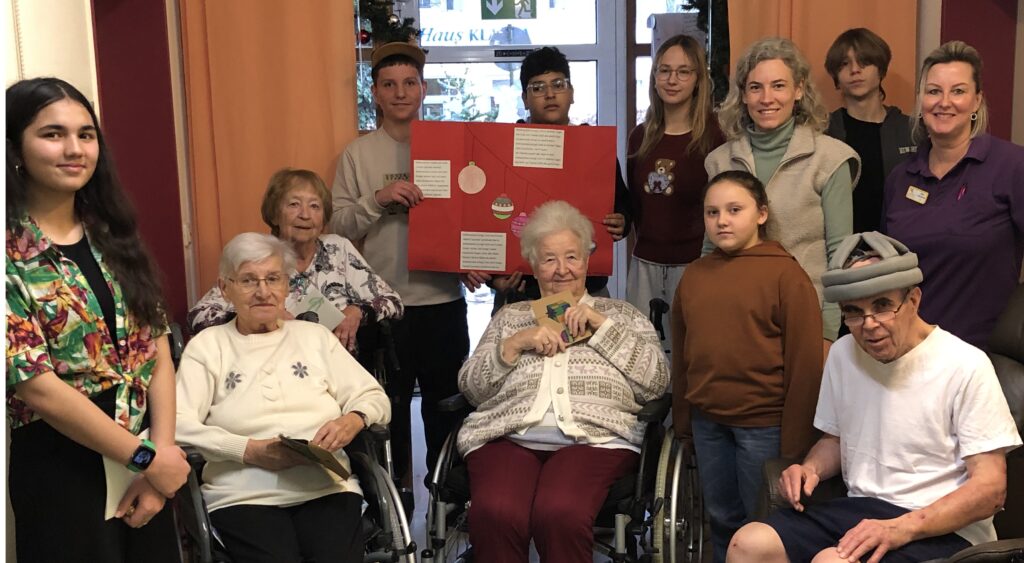 Mit ihrer Lehrerin Ines Brinker besuchten die Jungen und Mädchen der Deutschklasse der Mittelschule Meitingen kurz vor den Weihnachtsferien die Seniorinnen und Senioren im Laubenbach. Sie kamen nicht mit leeren Händen. Im Deutschunterricht verfassten sie Gedichte und hielten diese auf einem weihnachtlich verzierten Plakat fest. Bei ihrem Besuch stellten sich die Schülerinnen und Schüler einzeln vor und erzählten auch, aus welchem Land sie kommen. Für jeden anwesenden Bewohner gab es eine individuell gestaltete Karte, auch die bettlägerigen Bewohner durften sich über liebevoll verzierte Weihnachtsgrüße freuen. Die Seniorinnen und Senioren bedankten sich als „Gage“ mit einigen Weihnachtsliedern und luden alle zum Mitsingen ein. Lobende Worte kamen von der Pflegekraft Anita Deisenhofer.